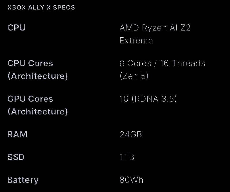 Xbox Ally采用了和三年前的Steam Deck相似的芯片,但Xbox Ally X配置顶尖,采用了AMD锐龙AI Z2 Extreme处理器,24GB高速内存,1080P屏幕(120Hz刷新率)以及1TB的SSD。