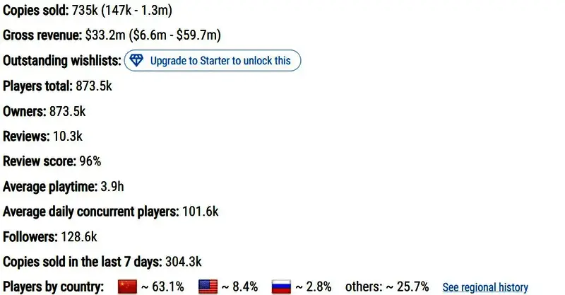 Gamalytic还显示,Steam上《剑星》总共有87.3万名玩家,销量73.5万,但这个数据可能不准确。开发商Shift Up尚未公布游戏的销量,不过鉴于首发玩家数量,估计会公布。游戏刚上线不久,这些统计数据可能不太精准。