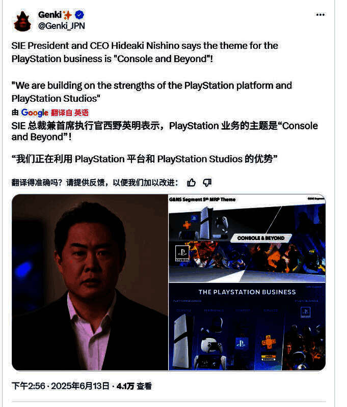 Switch 2在上周(6.5)发售,首发销量分别创下全球和日本地区硬件销量纪录。在周五的索尼业务部门会议上,SIE总裁西野英明被问及他是否担心Switch 2的硬件提升以及任天堂与第三方发行商关系的改善会在未来几年给PlayStation带来更激烈的竞争。