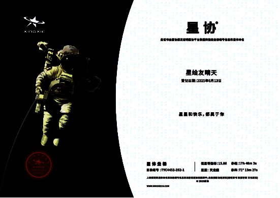 除了游戏中“点击就送”的星球外,《星绘友晴天》也在现实中赠与全体玩家一颗星星:编号TYC4432-252-1,以“星绘友晴天”命名(也代表全体玩家“星友”)。无论玩家在何处,只要抬起头,那里总有一颗星星、一份快乐属于大家。