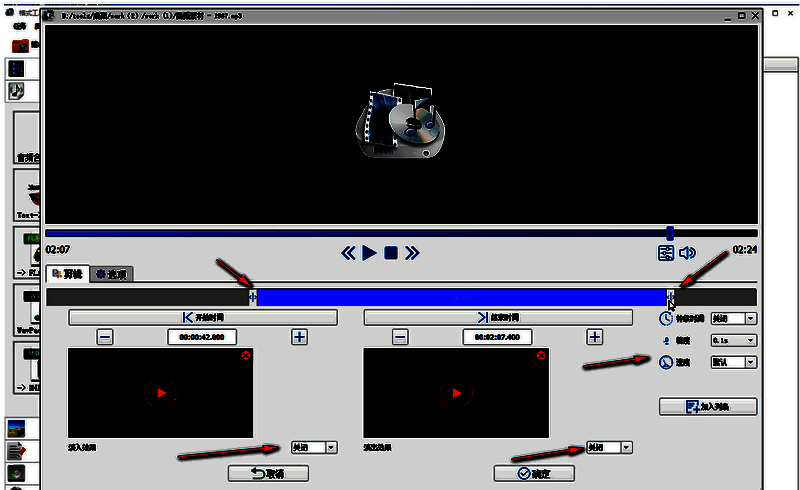 4.编辑音乐:点击文件旁的"选项",进入编辑窗口,通过拖动波形图选取需要的片段,设置淡入淡出效果,调整播放速度。