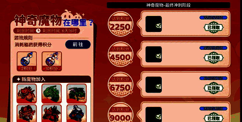 比如平民玩家,虽然可能不够在7天冲一轮,但可以冲200或500分,第一次魔物提升下战力顺便拿点资源也不错。