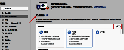 4、在右侧找到阻止跟踪项,点击下方跟踪防护右侧的开关按钮,如下图所示。