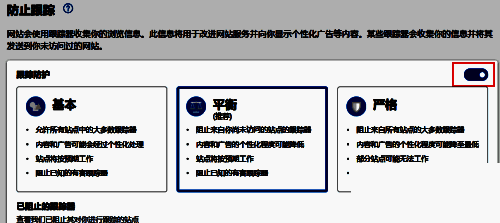 5、最后按钮变为蓝色即可启用跟踪防护功能,默认防止跟踪的等级为平衡,如下图所示。
