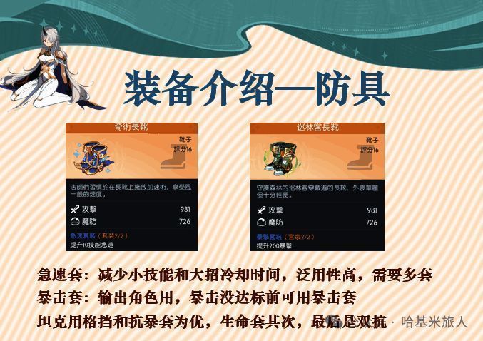 暴击套:输出角色用,游戏前期角色暴击属性有限(炎魔需要堆900暴击),后续魔物图鉴和神格会提供暴击,溢出可以更换其他套装。