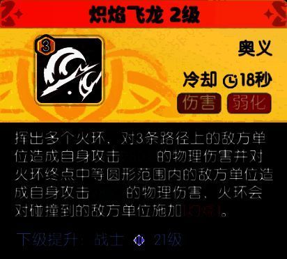 奥义:炽焰飞龙对前方范围造成高额物理伤害,并附加【灼烧】效果。
