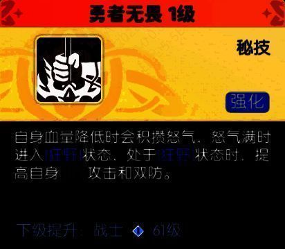 秘技:勇者无畏血量降低时积攒怒气,进入【狂野】状态:提升自身攻击力与双防;释放技能时生成护盾,增强生存能力。