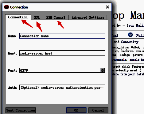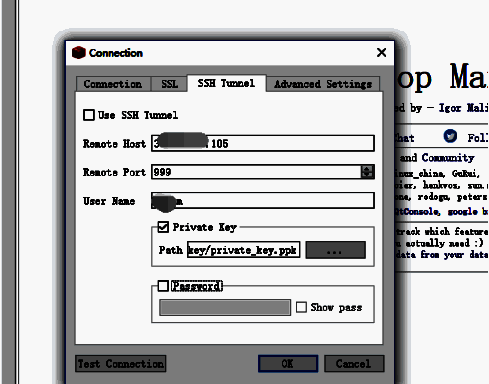 4. 找到SSH Tunnel选项卡,输入ip 端口号以及用户名和密码(或者私钥的文件路径)。此步骤需要在服务 器中安装配置好redis或者本机安装配置好redis