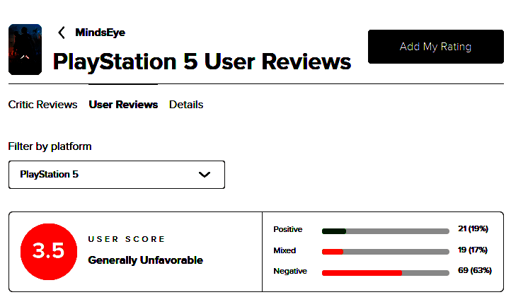 游戏宣传时带上往日荣光或许不一定是好事,顶着前GTA制作人开发大名,《心之眼》发售前引发万众期待,但发售后喜闻乐见,期望越大失望就越大,一片差评袭来,最新M站玩家均分3.5,不过评价些许到提升褒贬不一。