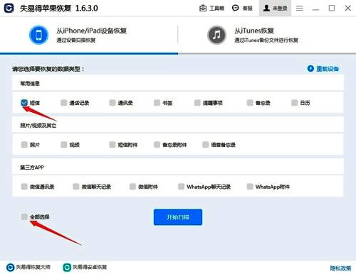 3.连接成功之后程序会进入选择恢复数据类型的界面,我们在这里先点击左下角的“全部选择”按钮,来取消所有类别的勾选,再点击勾选常用信息下的“短信”。
