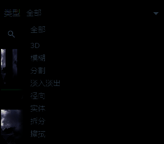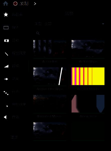 2、文件夹中的效果太多怎么办?你可以打开如下图所示的菜单,根据转场效果的类型来进行选择,除了上文中介绍到的3D、分割和淡入淡出外,还有许多种不同选项可供选择。完成选择后,将相应的转场拖动到下方时间轴中的素材后就可以使用了。