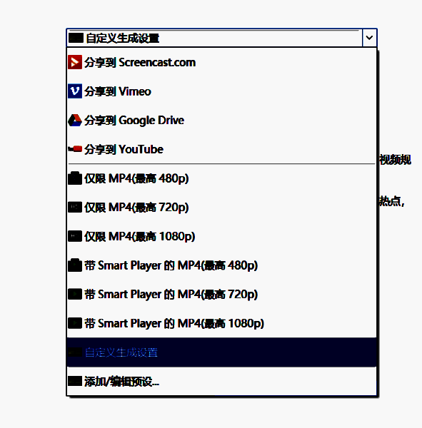 4.如果在导出时还需要对水印、音频等一些细节进行设置,也可以在图2所示的菜单中选择自定义生成设置。选择了该选项后,可以自行选择最终视频的文件格式。除了常用的mp4格式外,还包括了wmv、avi等其他格式。