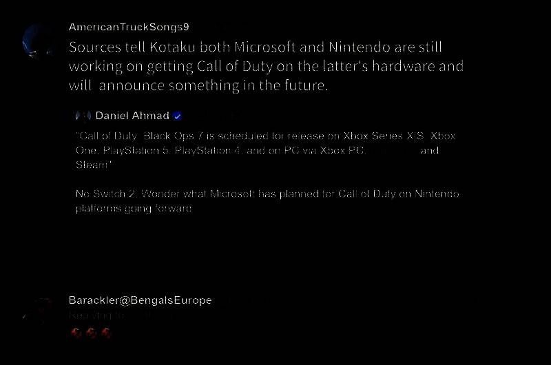 外媒Kotaku资深记者在社交媒体上发文称,微软和任天堂正在合作将《使命召唤:黑色行动7》带动Switch 2平台。
