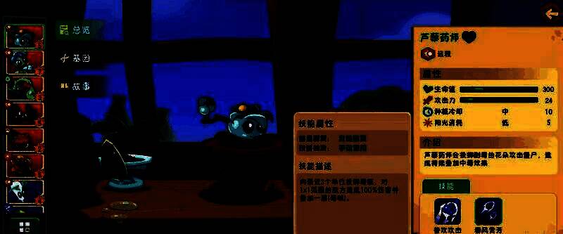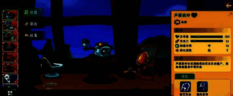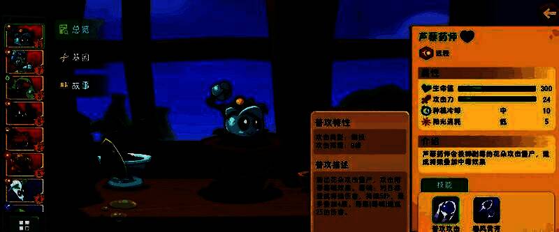 芦藜药师是属于远程输出类型,自身的生命值300,点攻击力24,种植冷却中等,阳光消耗低,只需要5点阳光就可以种植下去。芦藜药师可以投掷剧毒的花朵去攻击僵尸,造成持续叠加中毒效果,他的攻击技能有两个,分别是普通攻击和春风赏芳。