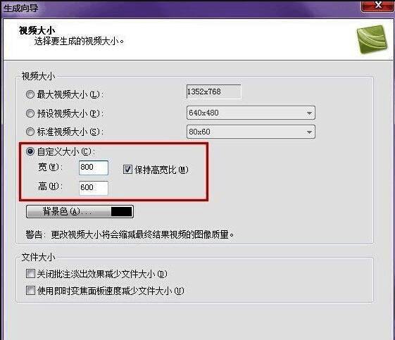 5.在视频大小设置中,选择“自定义大小”。确保勾选“保持高宽比”,并将宽度设置为800像素。