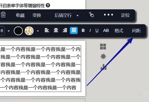 3、接着在新建的图文中,输入标题名称、内容,在出现的菜单框中,点击【间距】,如下图所示。