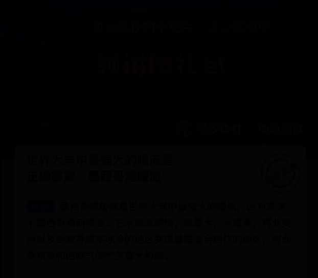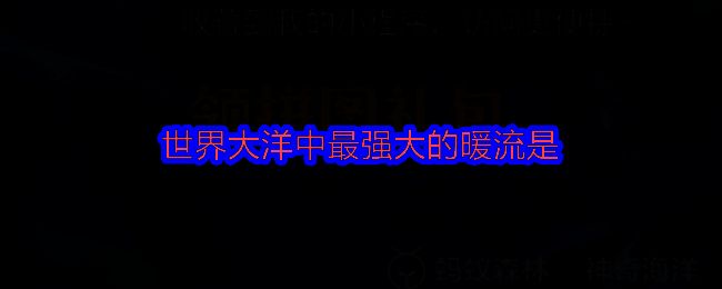 支付宝蚂蚁森林神奇海洋2025年6月13日问题已经更新,今日题目是:世界大洋中最强大的暖流是?正确答案是:【墨西哥湾暖流】。墨西哥湾暖流是世界大洋中最强大的暖流,因为发源于墨西哥湾而得名。