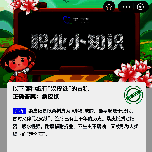 以下哪种纸有“汉皮纸”的古称?这是支付宝蚂蚁新村2025年6月13日题目,每天在蚂蚁新村答题,不仅能学到有趣的职业小知识,还能提高木兰币的产速,帮助小镇建设。今天正确答案是【桑皮纸】。桑皮纸是以桑树皮为原料制成的,最早起源于汉代,古时又称“汉皮纸”,迄今已有上千年的历史考古发现显示,新疆出土的东汉时期纸质文书经鉴定确认为桑皮纸,这进一步印证了“汉皮纸”即为桑皮纸的历史依据。