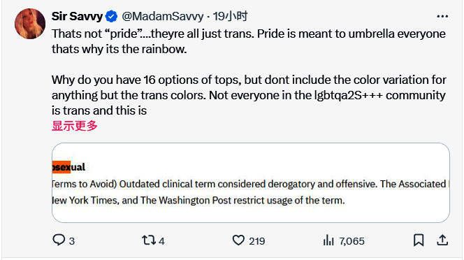 为什么你们有16种上衣选择,却只提供跨性别颜色的款式?LGBTQA2S+++社区里并非所有人都是跨性别者,这本身就是排他性的。