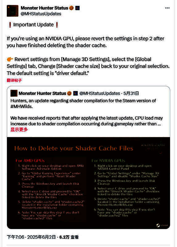 近日,《怪物猎人:荒野》客服官推发布消息,称收到用户反馈,在更新最新补丁后,由于着色器编译发生在游玩期间而非启动游戏时,导致CPU的负载提升,只有等到着色器编译完成才能性能稳定下来。