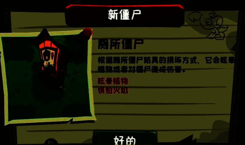 厕所僵尸是游戏中新加入的一种僵尸,其初始状态下会扛着一个木质的厕所,打破后就会变成正常的普通僵尸。但要注意,在打破厕所时,要是用全程都用的是非火焰类的植物,那在测试爆开时,僵尸会扔出道具,眩晕它所在的直线上的僵尸,且眩晕期间所有植物都无法攻击,特殊能力也不会起效。