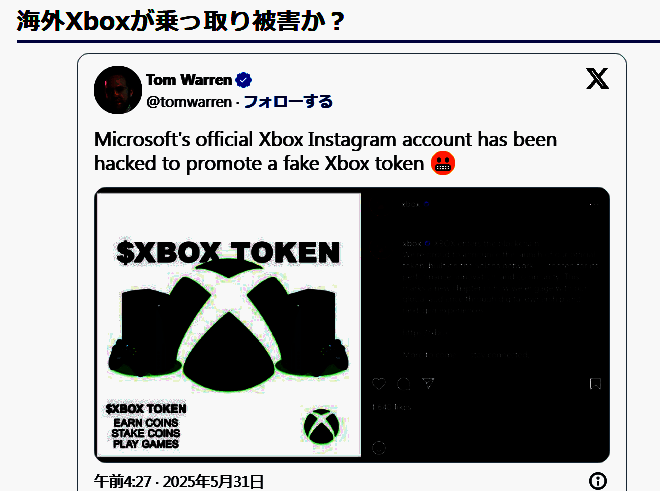 •Tom Warren根据种种迹象分析或许是官方账号被黑,因为没有任何迹象表明Xbox Token的存在,此事已经被更多网友捕捉到,大型游戏论坛也在讨论如此大企业居然也被黑。