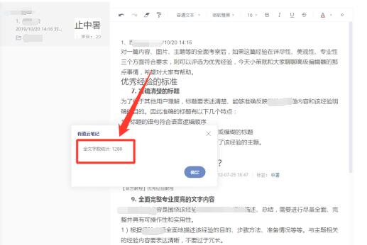 在弹出的窗口中,查看有道云笔记统计字数效果情况。