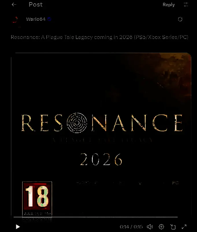 《共鸣:瘟疫传说遗产》仍然由《瘟疫传说》系列工作室Asobo Studio开发,将于2026年发售,登陆Xbox Series X/S、PS5和PC平台。