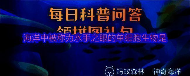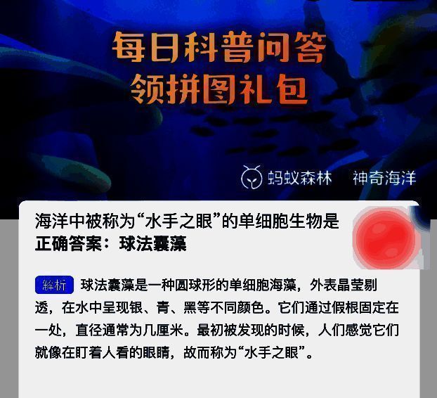 支付宝蚂蚁森林神奇海洋2025年6月16日问题已经更新,今日题目是:海洋中被称为“水手之眼”的单细胞生物是?正确答案是:【球法囊藻】。球法囊藻是一种圆球形的单细胞海藻,外表晶莹剔透,在水中呈现银、青、黑等不同颜色。