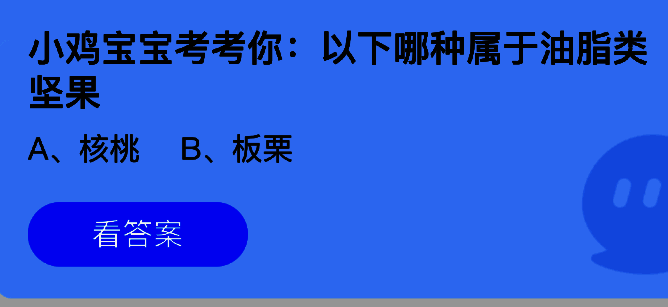 小鸡宝宝考考你:以下哪种属于油脂类坚果?这是支付宝蚂蚁庄园小鸡答题6月17日题目,支付宝小鸡答题是大家非常喜欢的活动,大家获取饲料就可以喂养小鸡领取更多的蛋去帮助更多的人了!今日正确答案是【核桃】,核桃脂肪含量较高(约50%-65%),符合油脂类坚果的定义(通常脂肪占比超过40%),因此被归类为油脂类坚果。