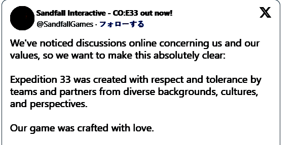 ·Sandfall Interactive强调了《光与影:33号远征队》是一支有这多样文化背景以及不同价值观的多元化团队打造的游戏,不希望游戏被当作传播仇恨的工具。