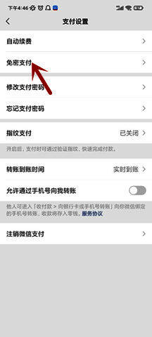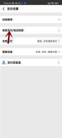 4、在【支付设置】页面找到【免密支付/自动扣款】,点击进入,在这里面就可以将酷狗音乐的自动续费取消掉了哦。