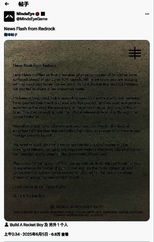 对此,开发商Build A Rocket Boy发布声明,警告可能提前获得游戏的玩家:首日更新补丁尚未发布。工作室在声明中表示:"Lenz News告知我们,部分《心之眼》实体盘已在6月10日发售日前流出,虽然理解大家与我们Build A Rocket Boy和IOI Partners同样兴奋,但有几项重要事项需要说明。"