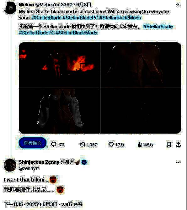 近日,《剑星》女主角伊芙的真人原型、韩国模特申在恩在社交平台掀起一场关于游戏MOD的有趣讨论。这位为游戏提供身体扫描数据的模特转发了MOD作者MelinaYor3360开发的透明比基尼造型,并配文“这件泳衣太棒了,我也想要同款”,迅速引发玩家社区的热烈反响。这已不是申在恩首次与游戏角色互动,此前她就经常在社交平台分享自己cos游戏角色的照片,展现对虚拟分身的高度认同。