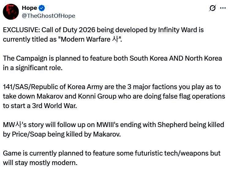 根据爆料人TheGhostOfHope透露,由Infiity Ward(IW)开发的2026版《使命召唤》的战役模式将给予韩国和朝鲜“重要戏份”,“사 ”,在韩语中代表数字4,因此新作其实是《现代战争4》。值得注意的是,早在2021年《使命召唤:先锋》发售数月前,便有消息称使命召唤系列将要以朝鲜半岛作为舞台。