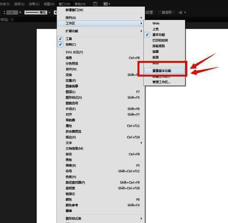 4、工作区——基本功能。点击窗口菜单栏,选择工作区,然后选择基本功能选项,打开默认的面板。
