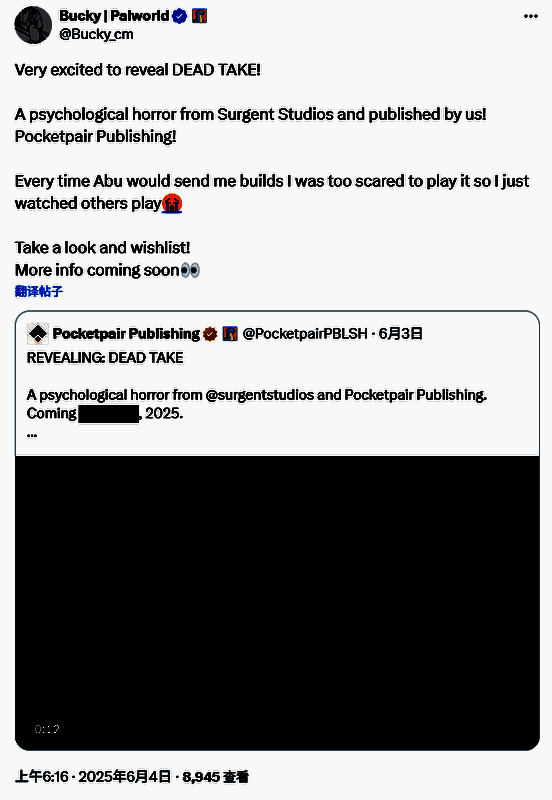 Pocketpair传播总监兼发行经理John "Bucky" Buckley在6月3日的推文中写道:"非常激动公布《遗映》!这是Surgent Studios开发的心理恐怖游戏,由我们Pocketpair Publishing发行!每次收到开发者Abubakar Salim发来的测试版,我都因为太害怕而只敢看别人实况。"推文结尾附带的痛哭表情符号颇具说服力。
