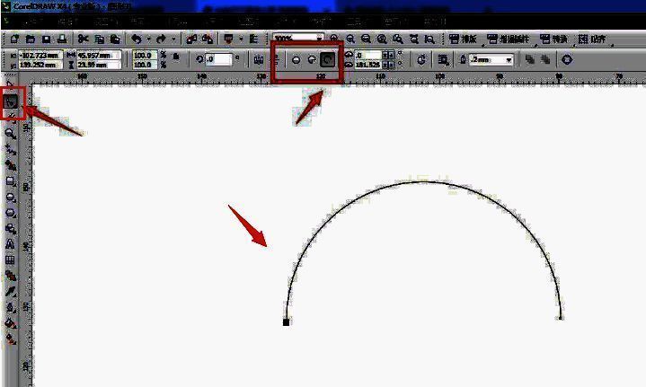 1.首先,打开CDR软件界面后,点击左侧工具栏中的弧线按钮,并设置弧线角度