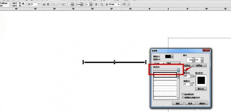 3、轮廓笔工具。点击工具栏中的轮廓笔工具,打开面板设置参数。