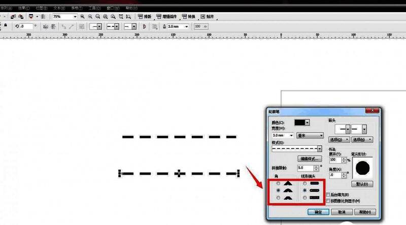 6、设置圆角端头。再次打开轮廓笔工具,在端头这里设置为圆头,角设置为圆角点击查看。