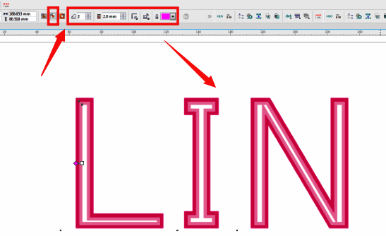 2.然后,选中文字点击轮廓图工具,将内轮廓修改为步长2,偏移2毫米效果