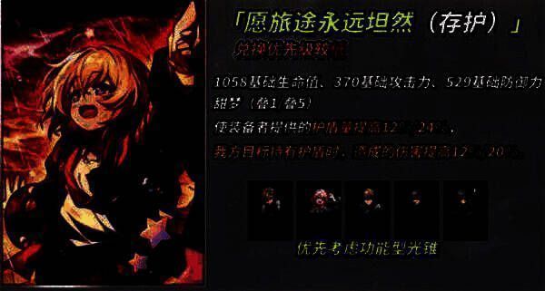 基础生命值极高(1058),攻击力偏低。叠满5层后可提供32%生命加成,并在忆灵攻击后附带24%治疗提升。