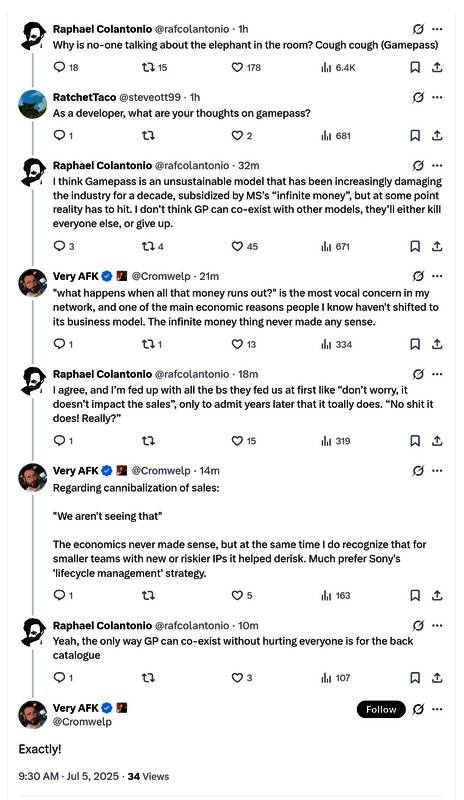 在社交媒体上,Raphaël Colantonio被粉丝问及从开发者的角度说,你对微软的Game Pass持有什么样的看法。他回复说:“GamePass是一个无法持续的商业模式,而且持续伤害了整个游戏行业很多年,它一直被微软的“无限资金”补贴,但到了某个时候必须面对现实。我认为Game Pass无法和其它模式(传统销售模式)共存,要么Game Pass消灭所有其他模式,要么它必须放弃。”。