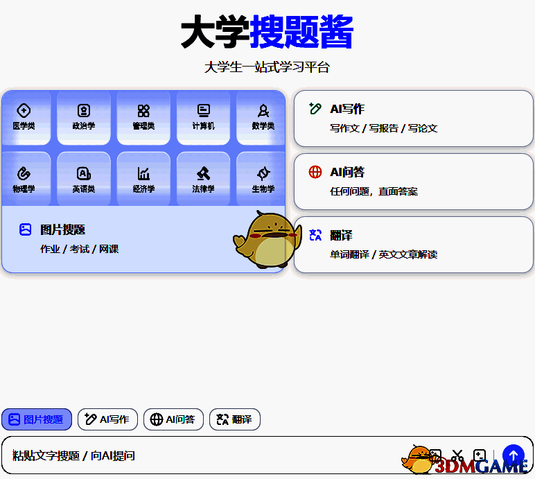1、首先,用户需要在浏览器中输入大学搜题酱的网址( www.daxuesoutijiang.com ),或者直接在搜索引擎中搜索“大学搜题酱网页版”来访问其官方网站。在官网上,用户可以找到一个“网页搜题”或类似的功能选项,点击进入搜题页面。