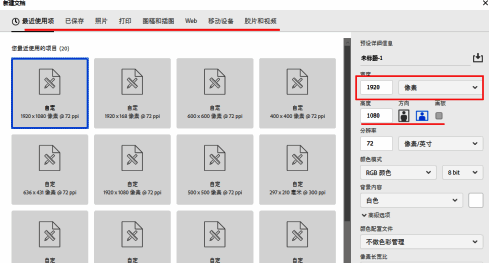 点击“新建”后默认进入到“最近使用项”这里存储了您近期创建过的画布尺寸大小;