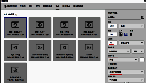 当进入到ps主界面,按Ctrl+N就能重新再次创建画布,这里选择“Web”中的画布分辨率为72;