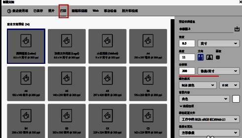 当选择“打印”、“照片”、“图稿和插图”中的画布分辨率是300;