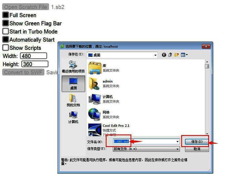 输入文件名,点保存,就可以自动将刚才选中的scratch文件转换成swf文件。