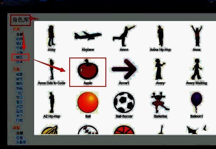 1.打开界面后,在角色库选项中找到物品分类,选择添加苹果角色