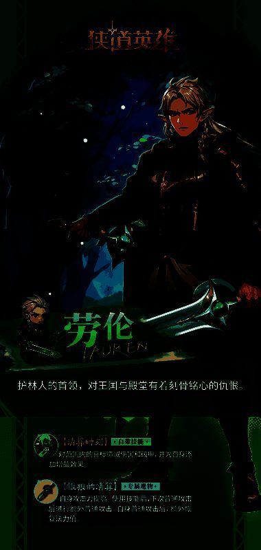 护林人的首领,对王国与殿堂有着刻骨铭心的仇恨。自身攻击力提高。使用技能后,下次普通攻击后进行额外普通攻击。下面是小编给大家带来的《狭道英雄》劳伦英雄档案,感兴趣的小伙伴们一起来看看吧。